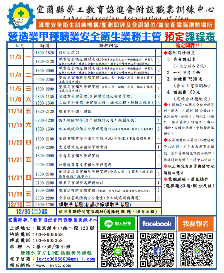 ※電話、傳真、線上報名參訓、報名成功者,將會回覆"報名序號",若無序號者,請勿自行前來上課(因現況報名須將資料上傳至職安署內部資訊系統,若無報名序號者切勿自行前來上課)※