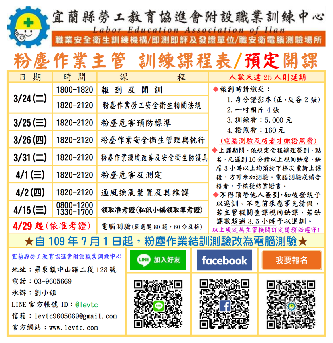 想知道本中心最新開課簡章或是勞安最新資訊嗎?為了讓您的勞安專業知識不落人後,趕快來我們的Facebook粉絲團網頁按讚,任何新資訊您將不會錯過~請至臉書搜尋”宜蘭縣勞工教育協進會”按一個讚即可得知最新消息。