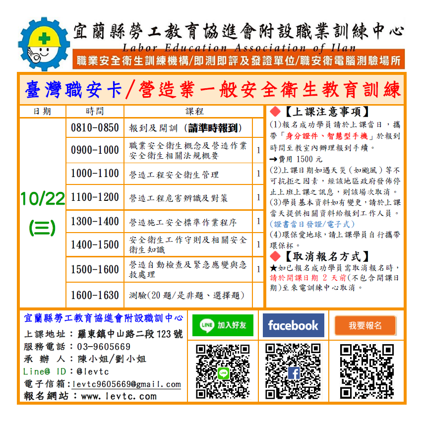 【臺灣職安卡】六小時(欲報名請點進來)10/22(三)日間班