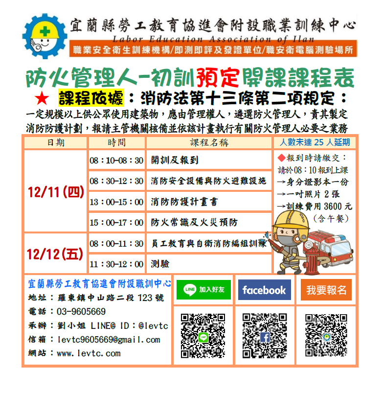 ★課程依據:消防法第十三條規定:一定規模以上供公眾使用建築物,應由管理權人,遴選防火管理人,責其製定消防防護計劃,報請主管機關核備並依該計畫執行有關防火管理人必要之業務。