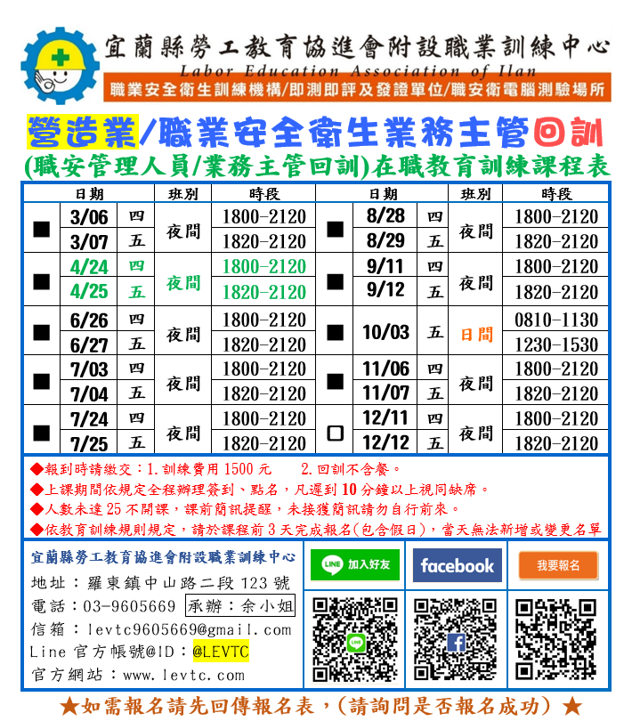 (營造業)【職業安全衛生業務主管】12/11~12/12夜間回訓(額滿為止)