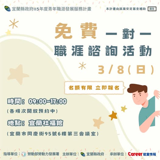 【宜蘭縣政府-免費一對一職涯諮詢】日期:3/8(日)