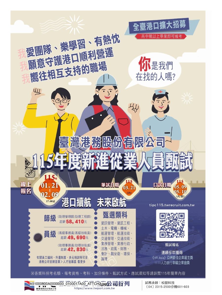 【招考訊息】臺灣港務股份有限公司115年度新進從業人員甄試