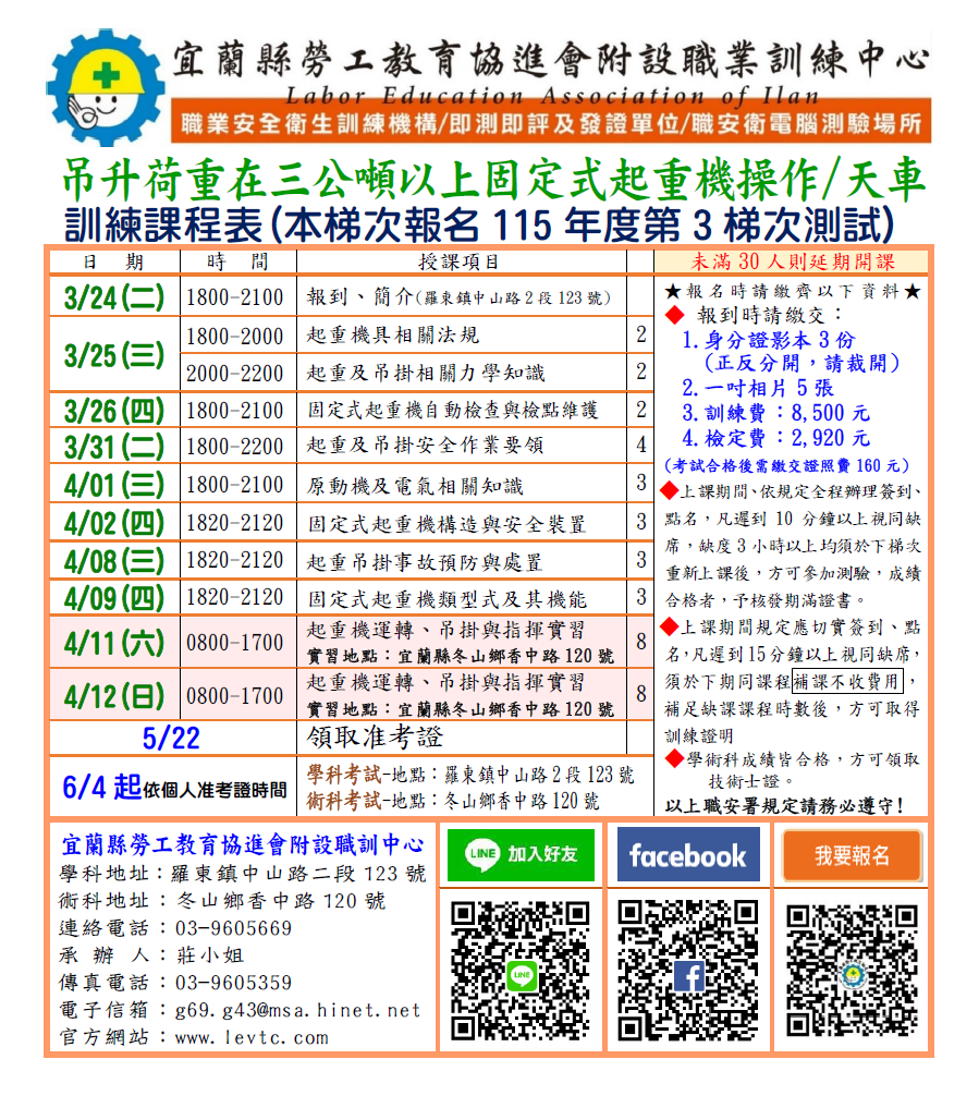 因開課前三禮拜須呈報上級主管機關報班,如課程及人數確定,請先麻煩傳真或來電報名統計人數。