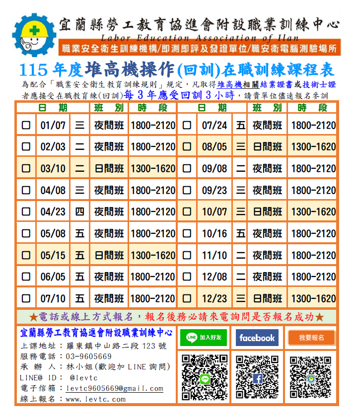 資格限制:凡取得 堆高機相關 結業證書或技術士證者,每三年應接受3小時之在職教育訓練。