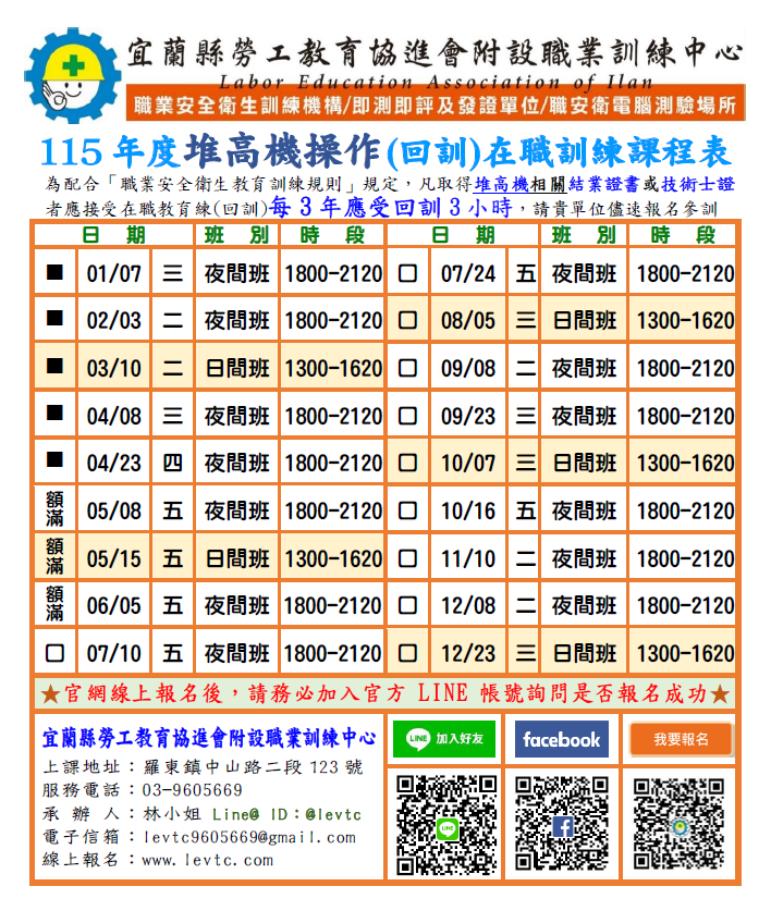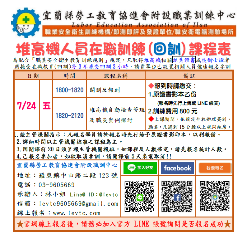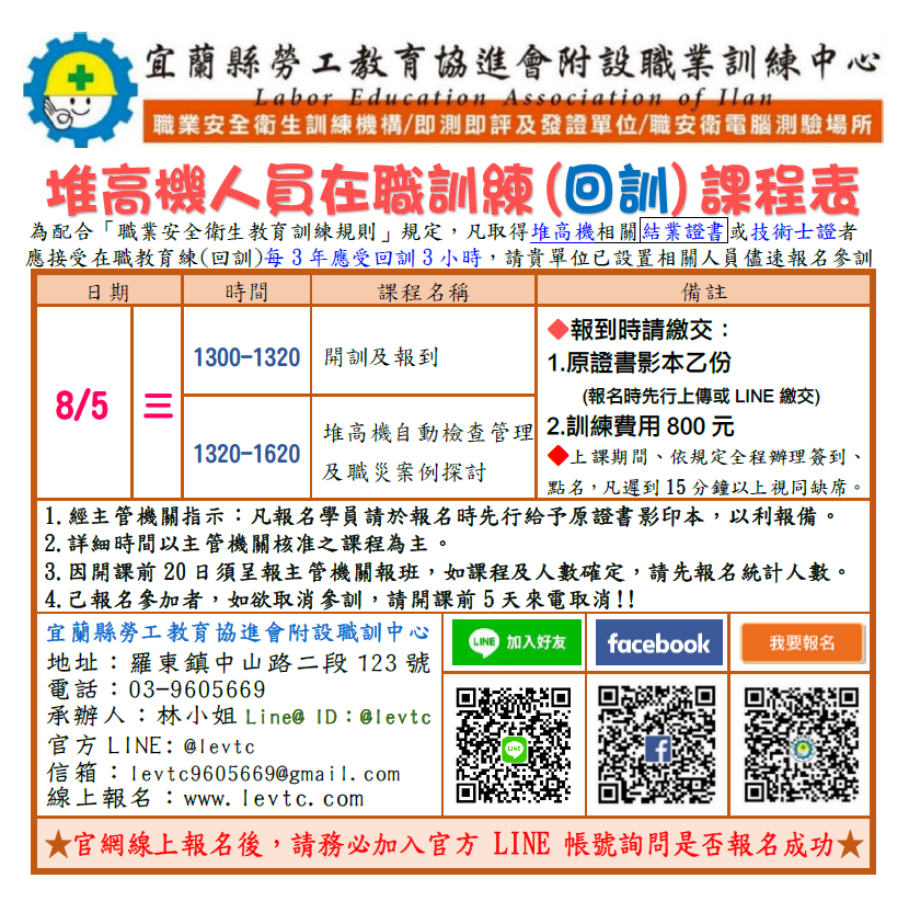 資格限制:凡取得 堆高機相關 結業證書或技術士證者,每三年應接受3小時之在職教育訓練。