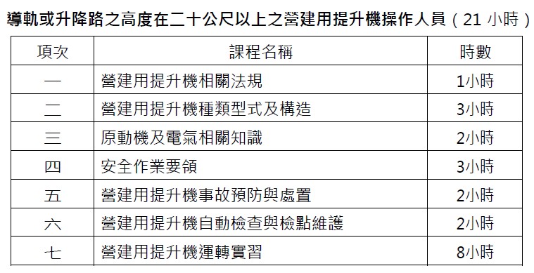 【導軌或升降路之高度在二十公尺以上之營建用提升機操作人員】安全衛生教育訓練