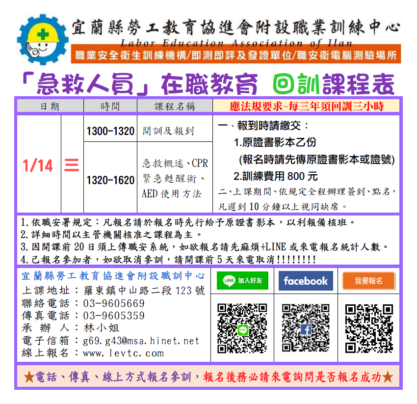 注意事項:★需先將「初訓證書」拍照傳至本中心官方LINE https://lin.ee/ePScPmd