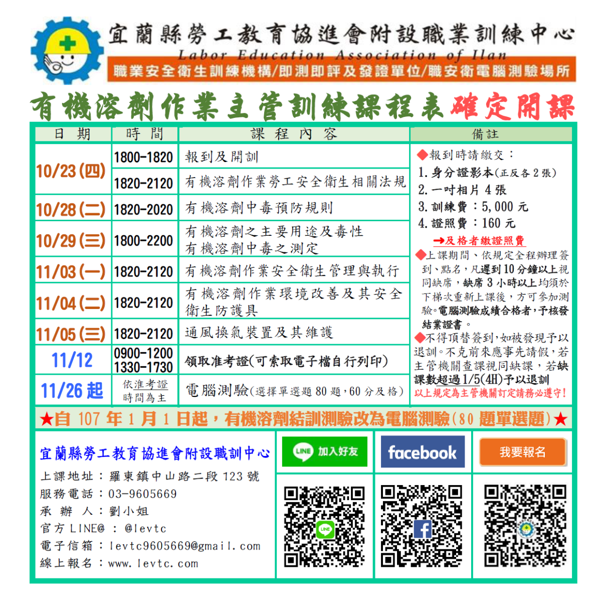 本課程總時數計18小時 1.有機溶劑作業勞工安全衛生相關法規(2小時) 2.有機溶劑中毒預防規則(3小時) 3.有機溶劑之主要用途及毒性(2小時) 4.有機溶劑之測定(2小時) 5.有機溶劑作業環境改善及安全衛生防護具(3小時) 6.通風換氣裝置及其維護(3小時) 7.有機溶劑作業安全衛生管理與執行(3小時)