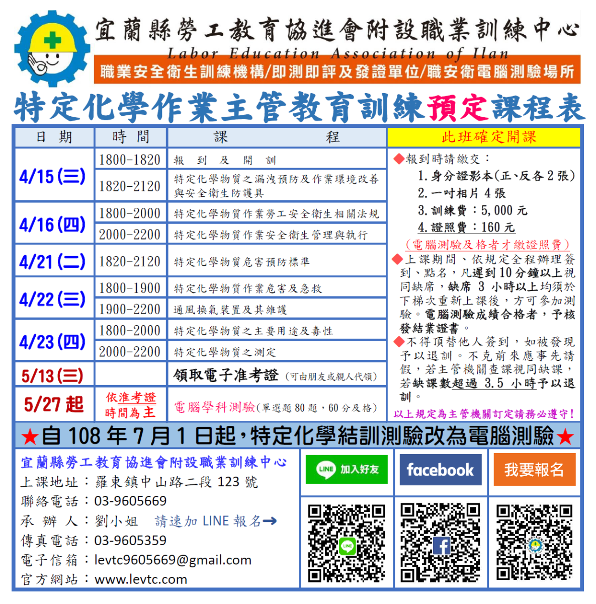 本課程總時數計18小時 1. 特定化學物質作業勞工安全衛生相關法規 (2小時) 2. 特定化學物質預防規則 (3小時) 3. 特定化學物質之主要用途及毒性 (2小時) 4. 特定化學物質之漏洩預防及作業環境改善及安全衛生防護具 (3小時) 5. 特定化學物質之測定 (2小時) 6. 特定化學物質作業危害及急救 (1小時) 7. 通風換氣裝置及其維護 (3小時) 8. 特定化學物質作業安全衛生管理與執行 (2小時)