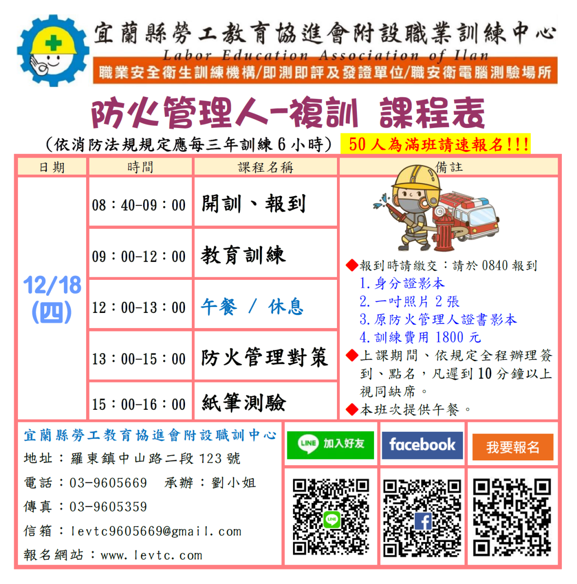擔任「防火管理人」者,需為管理或監督層次之人員,並經直轄市、縣(市)消防機關或中央消防機關認可之專業機構,接受12小時以上之講習訓練合格領有證書始得擔任。並且,每3年至少應接受複訓1次。 業務主要內容: