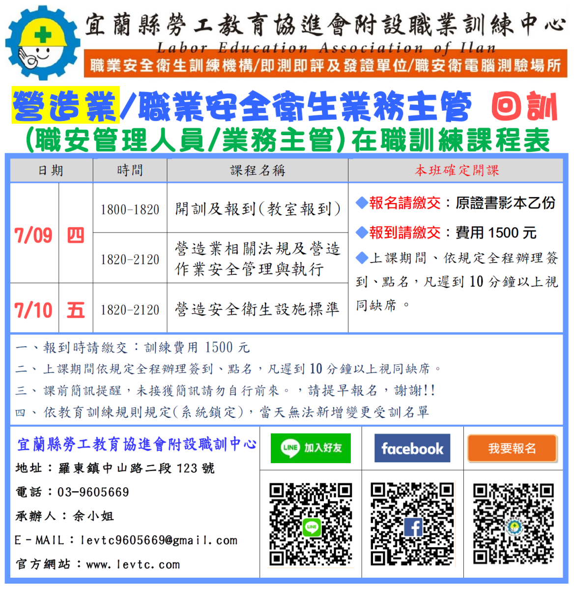 (營造業)【職業安全衛生業務主管】05/14~05/15夜間回訓(額滿為止)