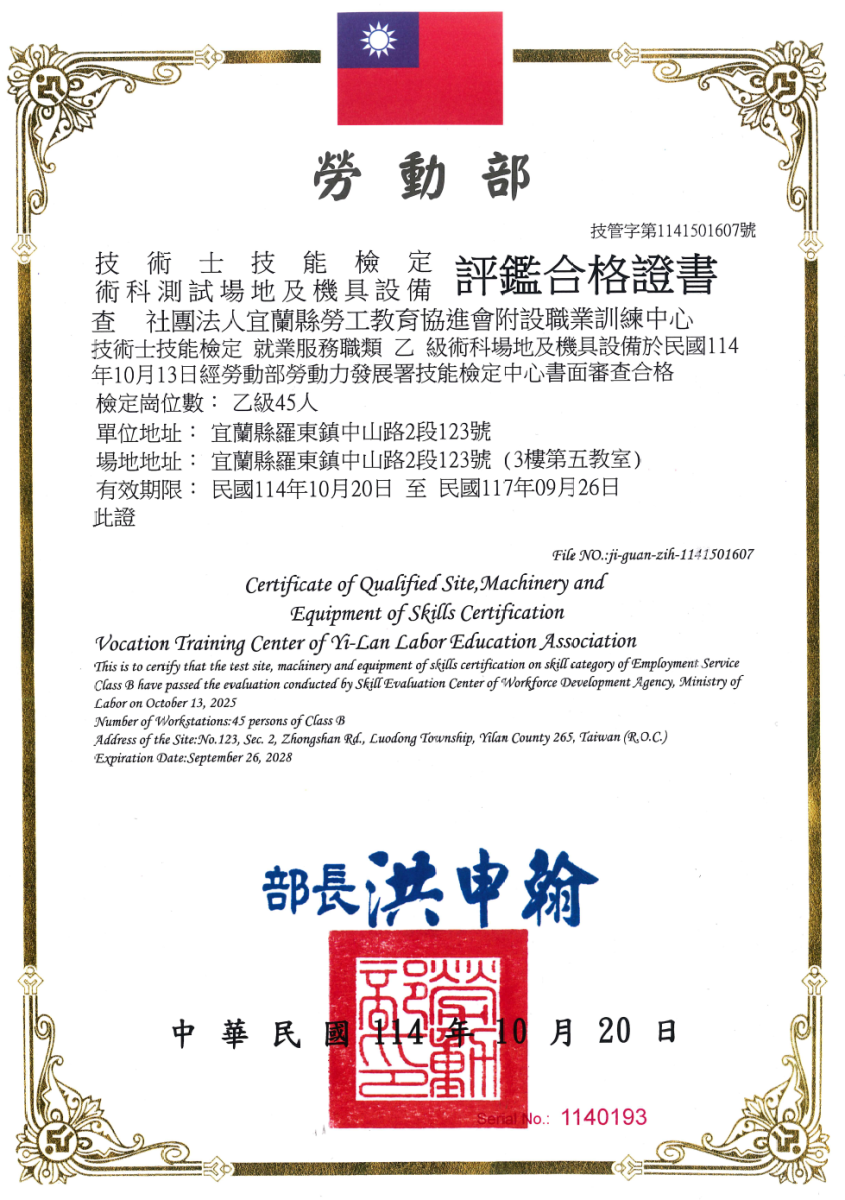 為協助在地民眾取得專業證照、強化就業競爭力,本中心經勞動部審核通過,新增設立「就業服務技能檢定試場」(乙級)及「國貿業務檢定試場」(丙級),正式納入本中心辦理之技能檢定職類範圍,進一步擴大本中心之服務能量。