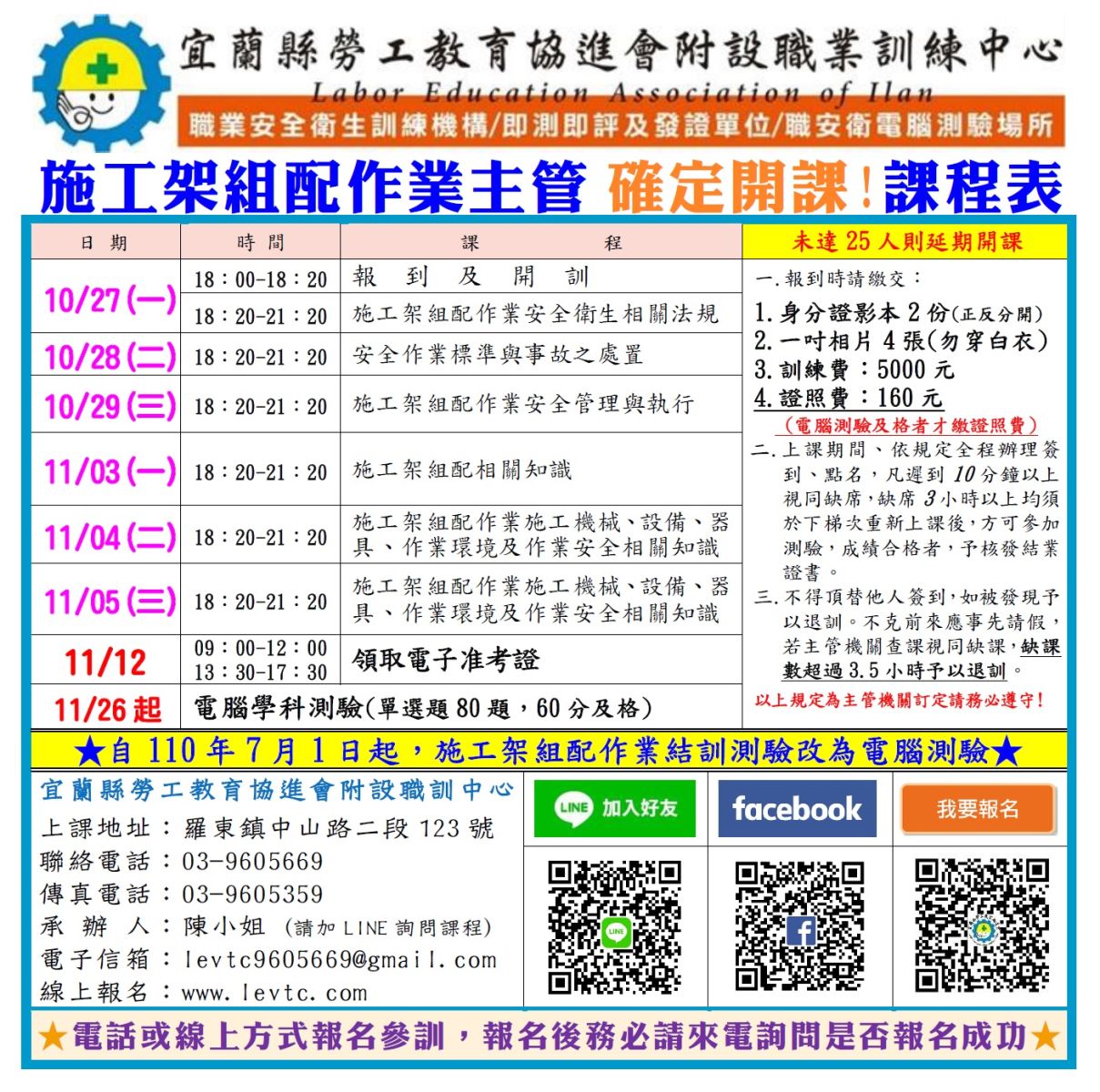 施工架作業主管安全衛生教育訓練課程(十八小時) 一、施工架作業安全衛生相關法規 三小時 二、施工架作業相關知識 三小時 三、施工架作業施工機械、設備、器具、作業環境及作業安全相關知識 六小時 四、安全作業標準與事故之處置 三小時 五、施工架作業安全管理與執行 三小時