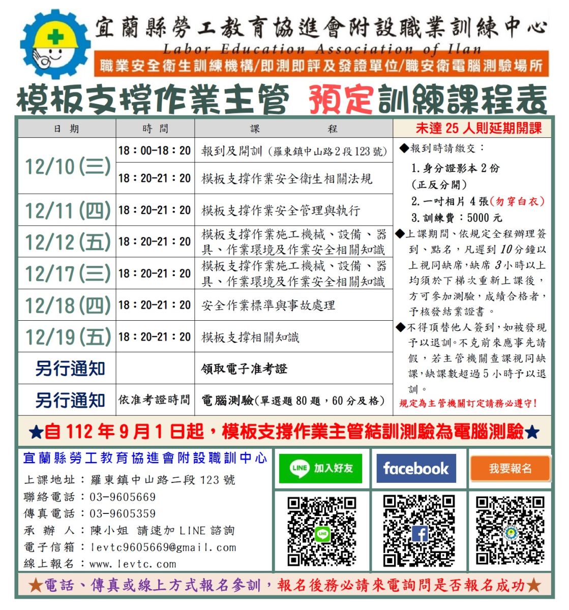 模板支撐作業主管安全衛生教育訓練課程(十八小時) 一、模板支撐作業安全衛生相關法規 三小時 二、模板支撐作業相關知識 三小時 三、模板支撐作業施工機械、設備、器具、作業環境及作業安全相關知識 六小時 四、安全作業標準與事故之處置 三小時 五、模板支撐作業安全管理與執行 三小時