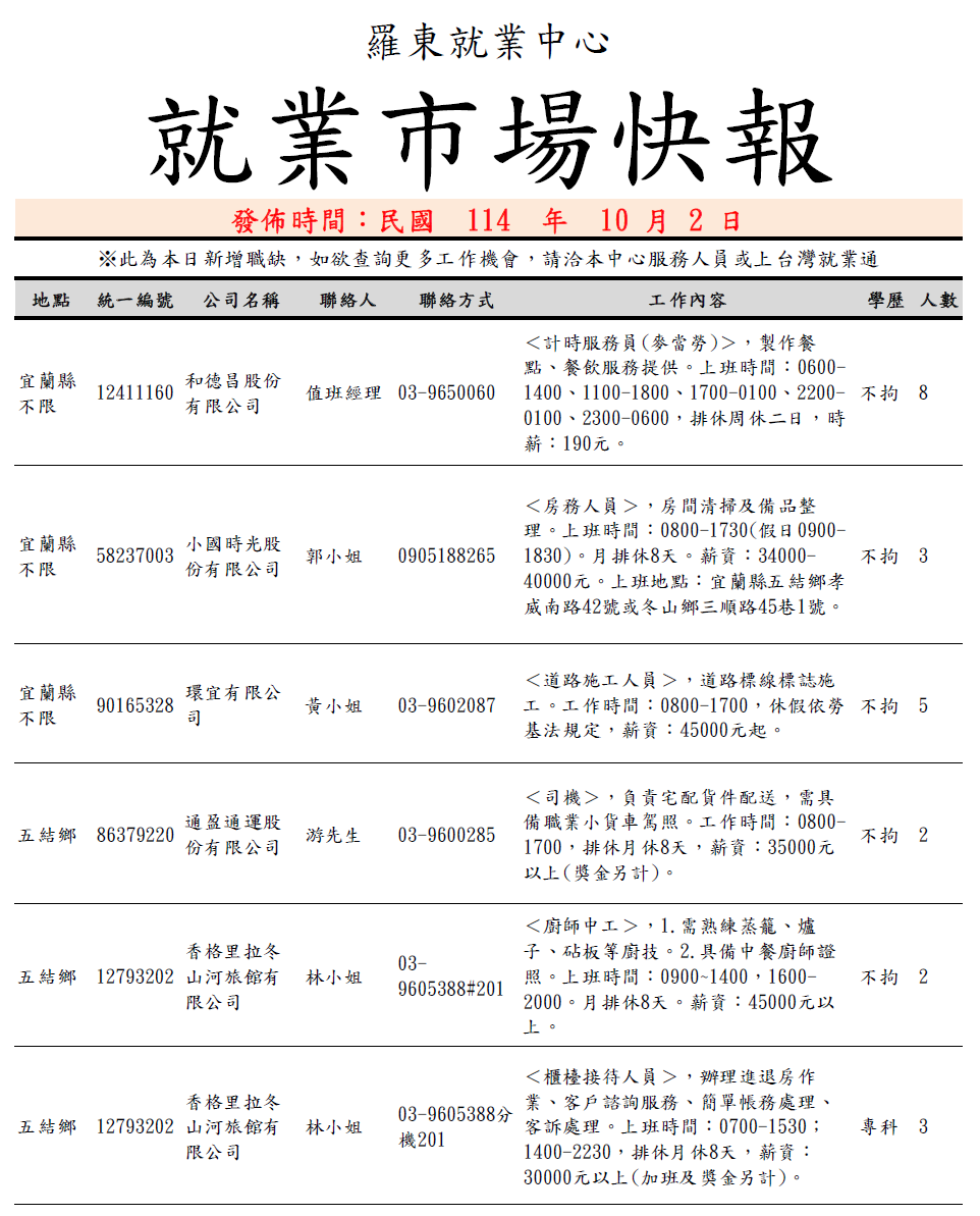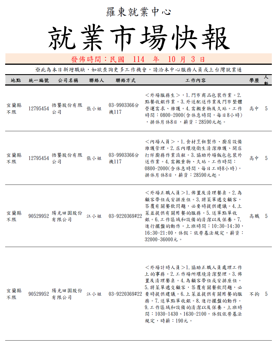 【徵才訊息】114年10月份,歡迎廠商免費刊登徵才訊息,就業媒合~