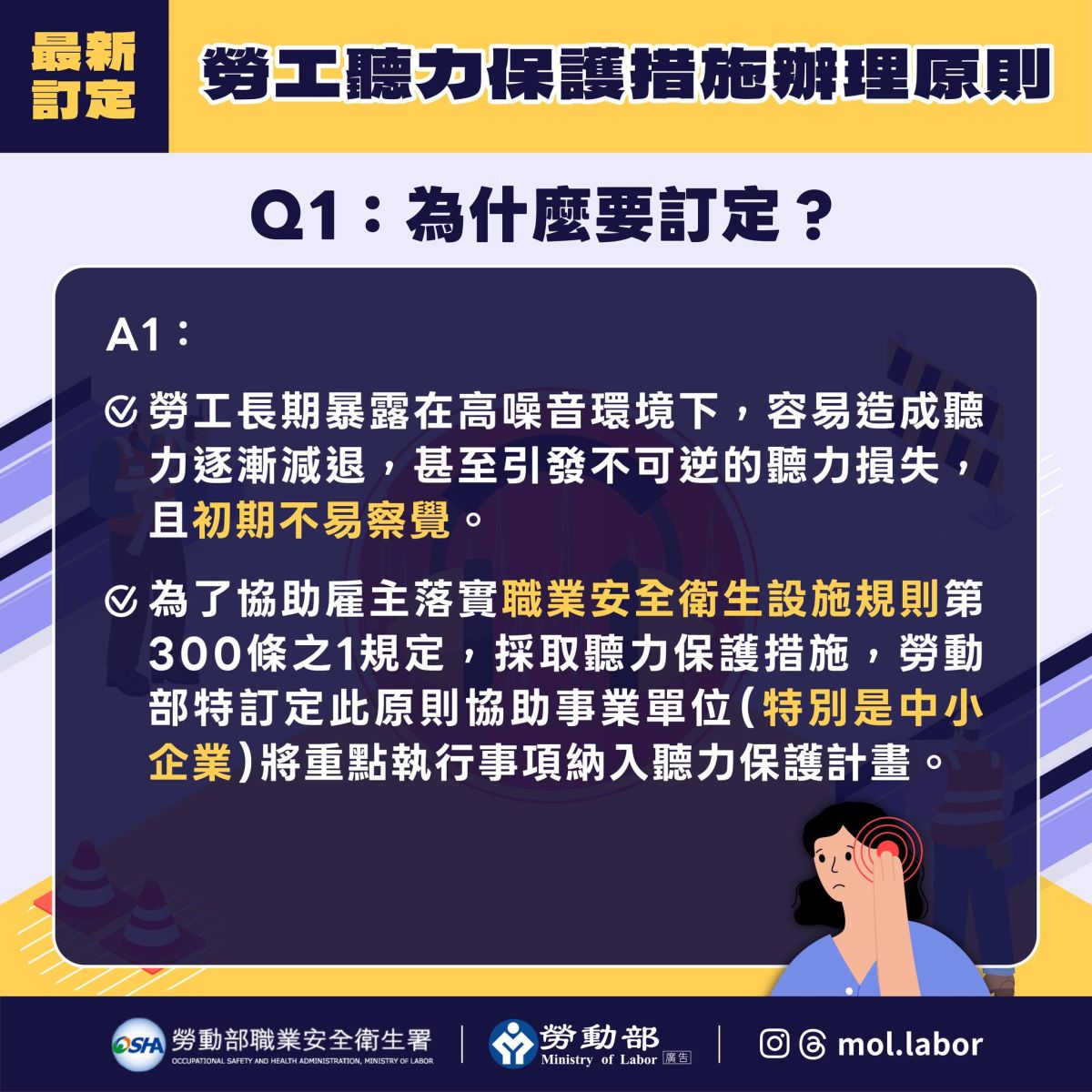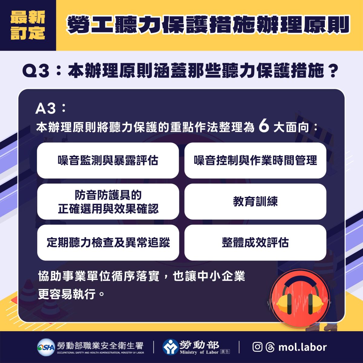 為了要協助企業強化廠場噪音的源頭管理與預防作為,勞動部訂定「勞工聽力保護措施辦理原則」,降低勞工因長期暴露噪音而產生聽力損失與相關健康危害!