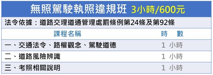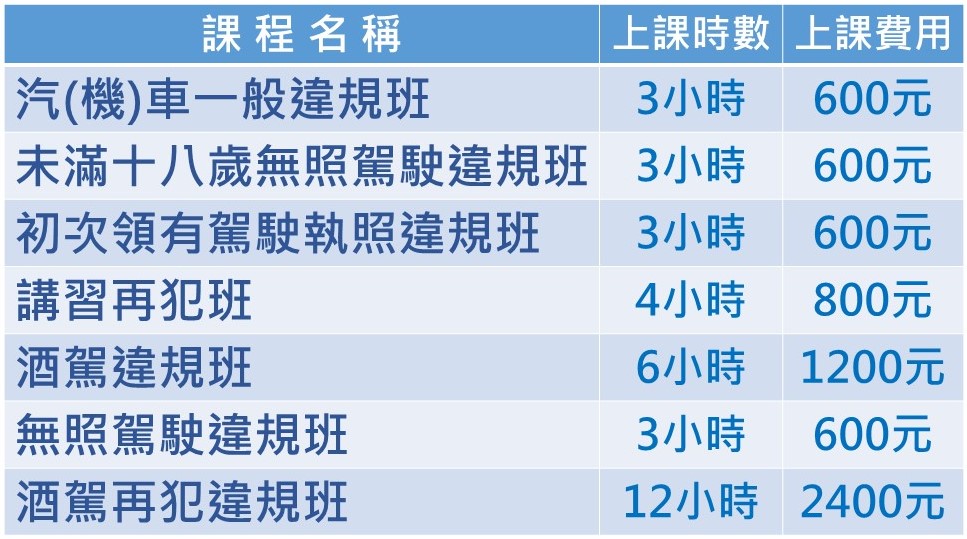 現在就想上課?! 但時段額滿了?線上無法報名? 我們現場也可以報名! 無論是等等想要上課或網路已截止報名 請直接來電或加入LINE,只要有開課,我們都盡可能協助補位報名 道安講習課程說明 汽(機)車一般違規班 未滿十八歲無照駕駛違規班 未滿18歲違規駕駛人須偕同監護人或法定代理人參加 初次領有駕駛執照違規班 講習再犯班 酒駕違規班 酒駕再犯違規班 無照駕駛違規班
