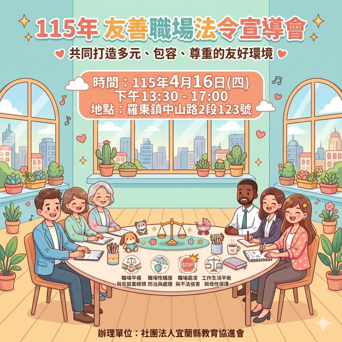 本中心訂於115年4月16日(下午13:30~下午17:00) 舉辦115年友善職場法令宣導會,歡迎踴躍報名參加。