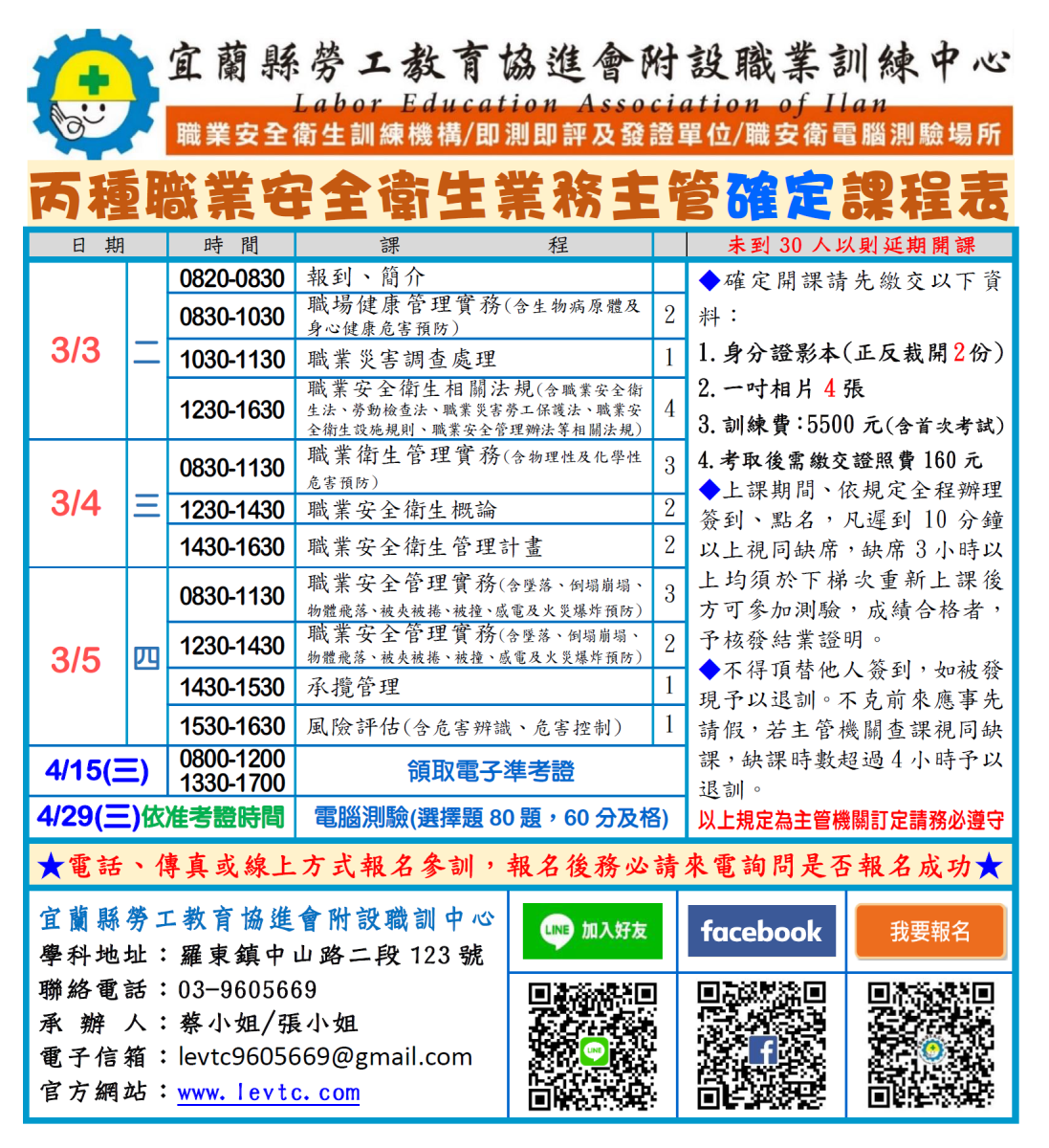 自106年1月1日起,勞動部公告【丙種職業安全衛生業務主管】及【營造業丙種職業安全衛生業務主管】等2種管理職類安全衛生教育訓練之結訓測驗,亦改採電腦測驗。