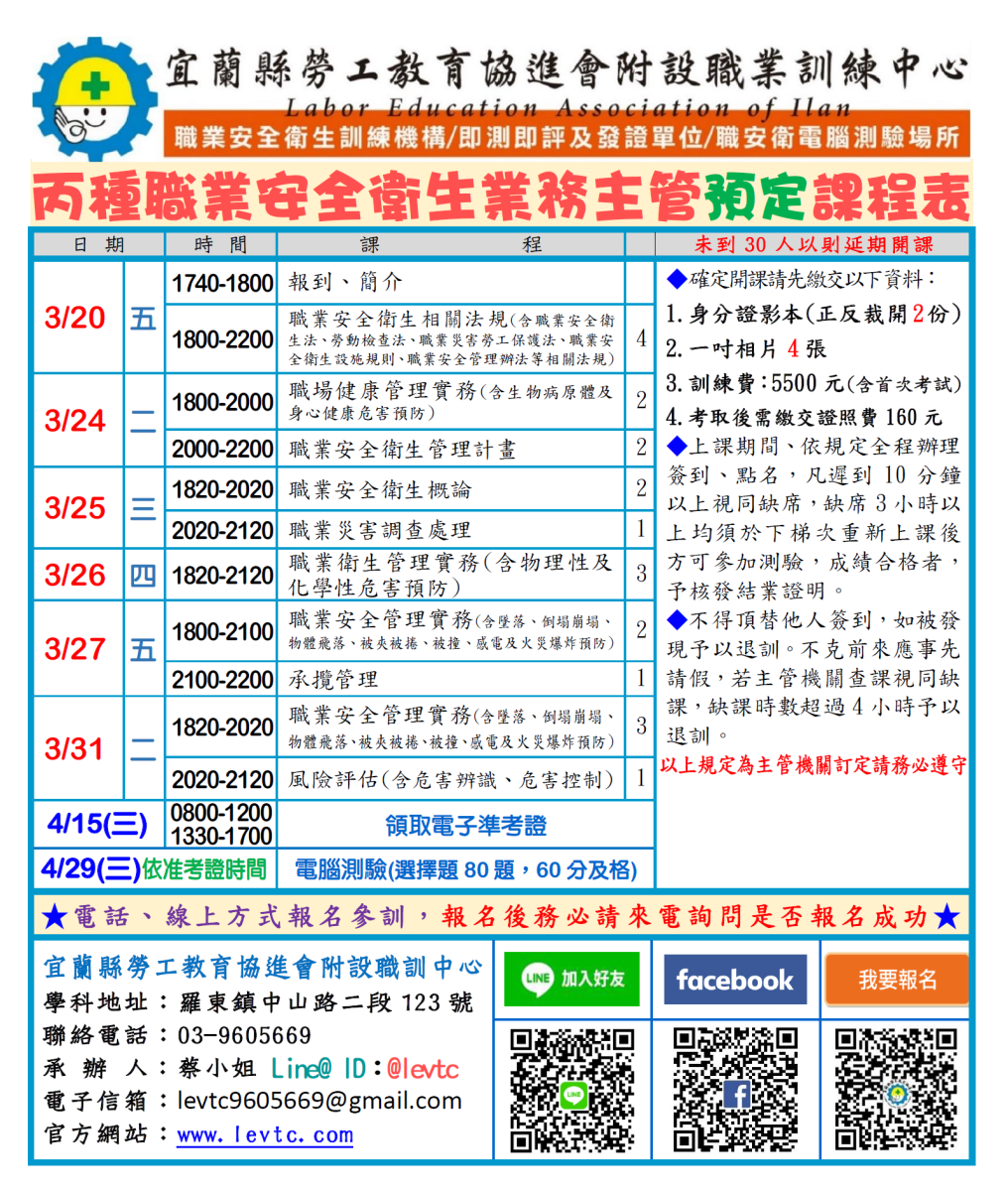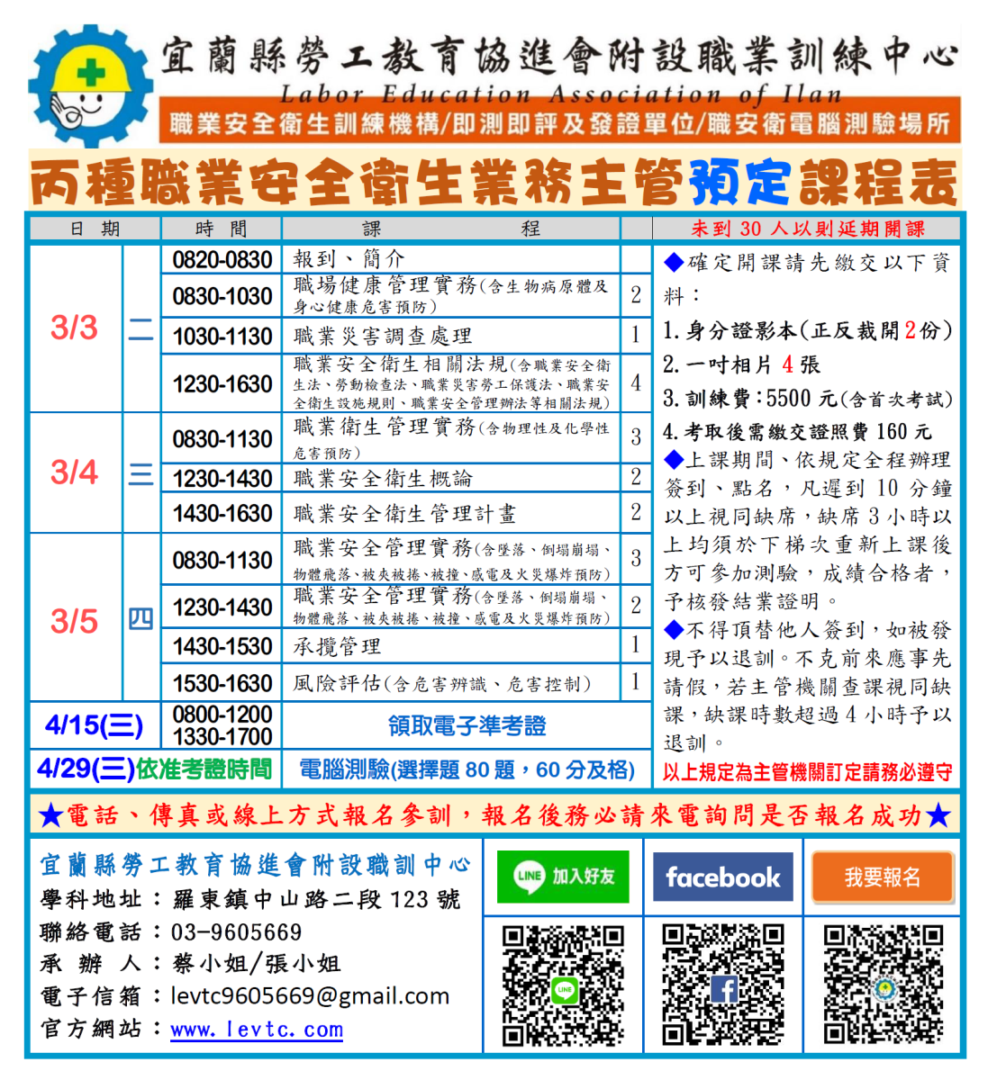 自106年1月1日起,勞動部公告【丙種職業安全衛生業務主管】及【營造業丙種職業安全衛生業務主管】等2種管理職類安全衛生教育訓練之結訓測驗,亦改採電腦測驗。