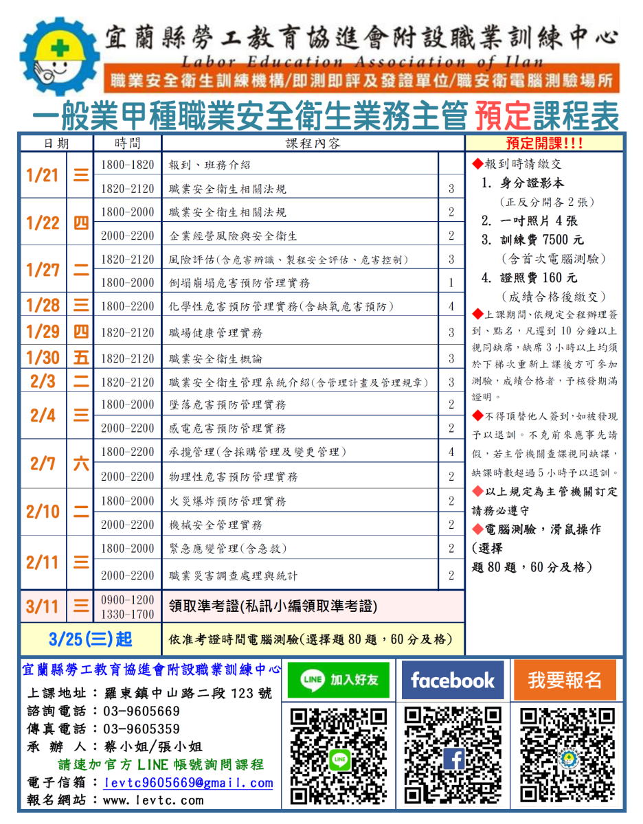 【一般業甲種職業安全衛生業務主管】夜間班 『招生中!!』~名額有限,請盡速報名~