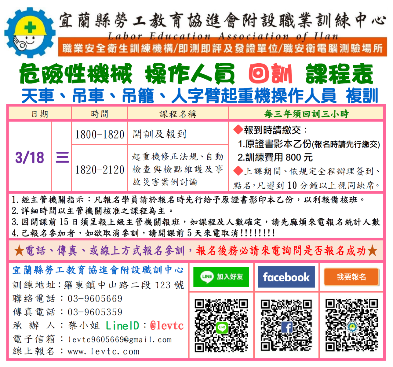 ★因職安署內部系統必須前三日上傳受訓人員資料,當日若無"報名序號"則無法上課。