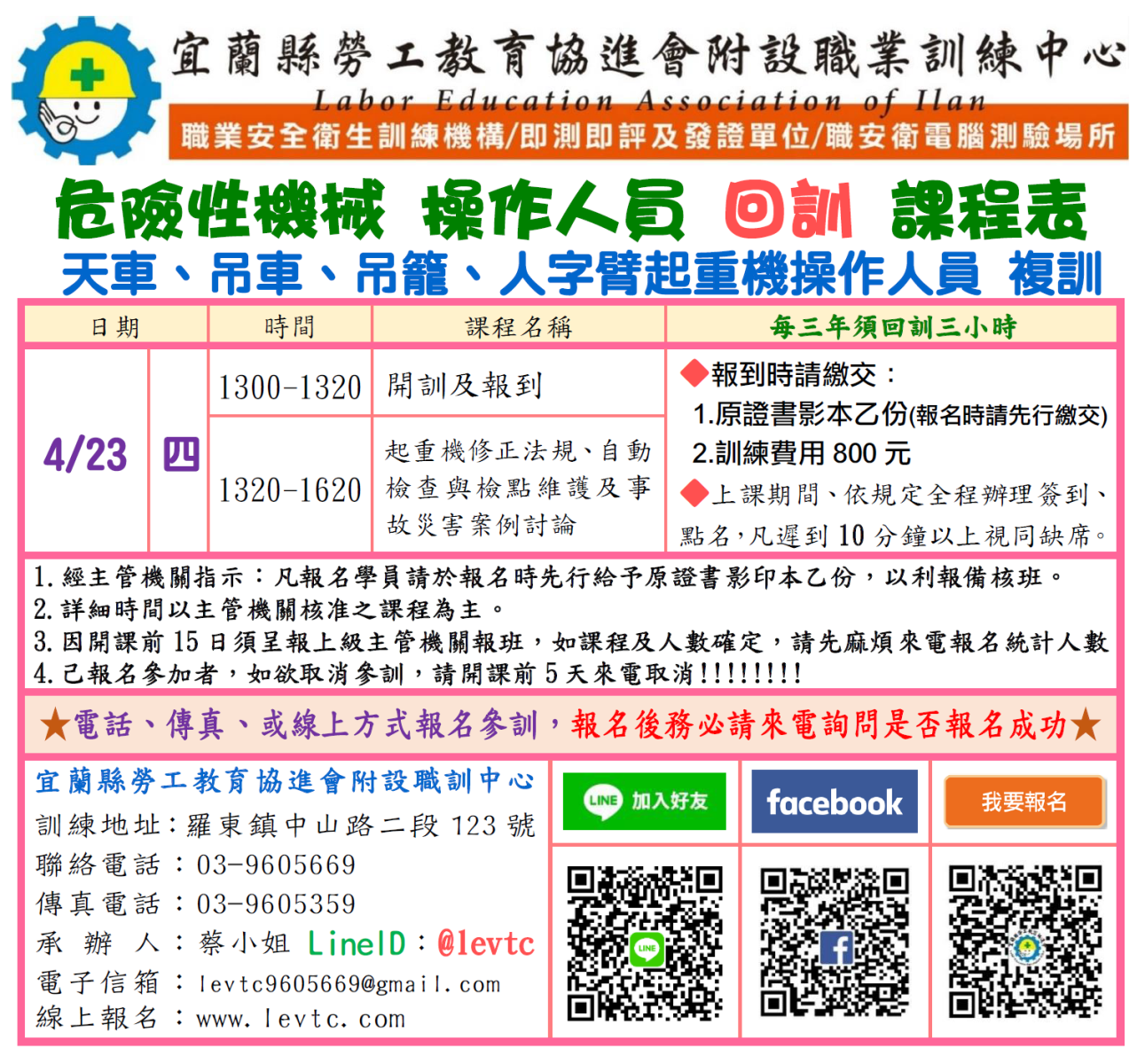 ★因職安署內部系統必須前三日上傳受訓人員資料,當日若無"報名序號"則無法上課。