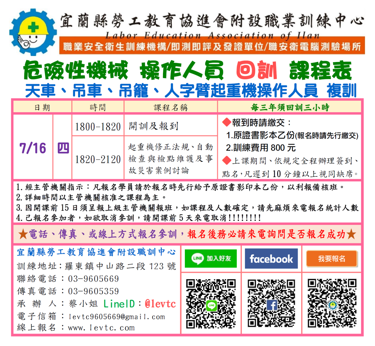 ★因職安署內部系統必須前三日上傳受訓人員資料,當日若無"報名序號"則無法上課。