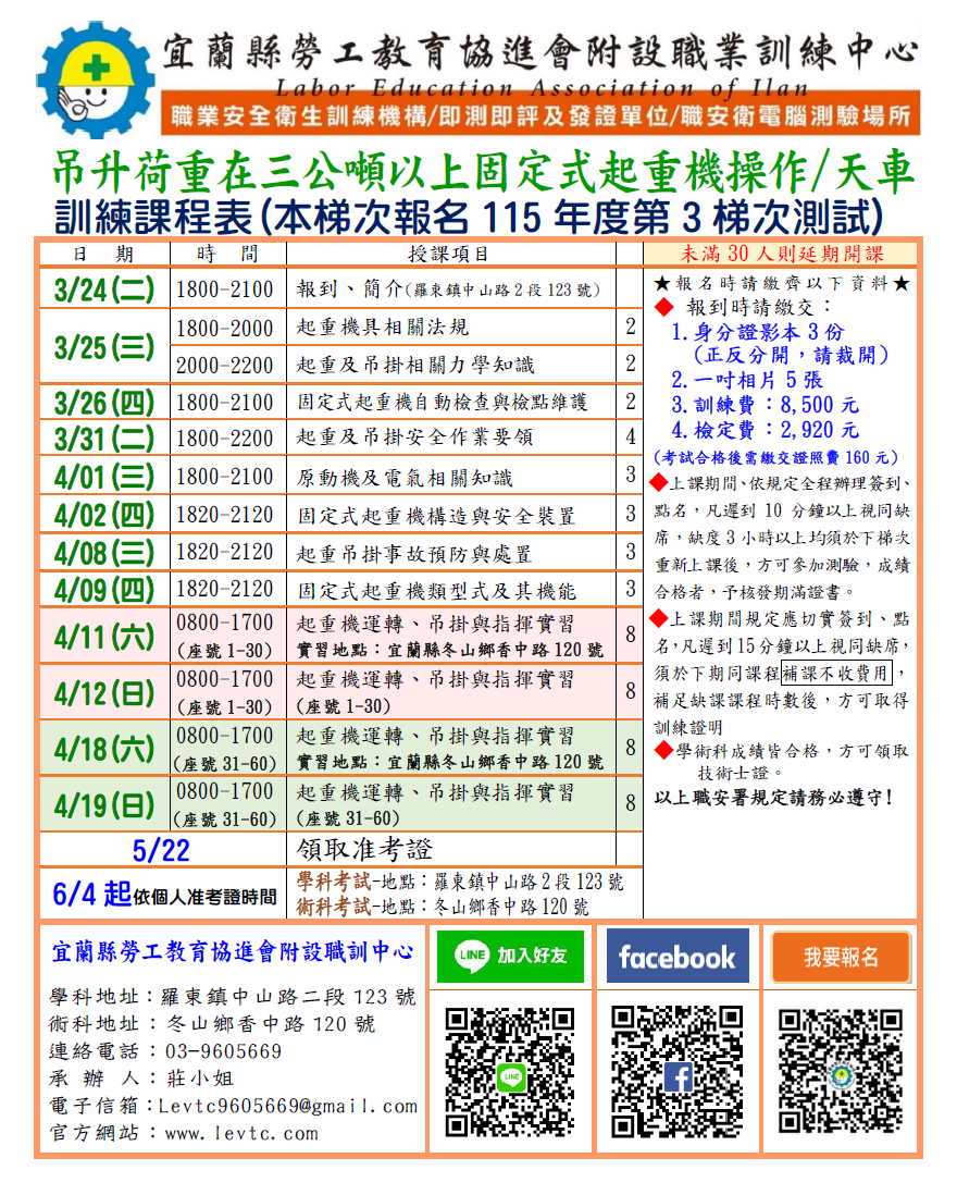 ※想知道本中心最新開課簡章或是勞安最新資訊嗎?為了讓你的勞安專業知識不落人後,趕快來我們的Facebook粉絲團網頁按讚或www.Levtc.com,任何新資訊您將不會錯過~ 請至臉書Facebook搜尋” 宜蘭縣勞工教育協進會” 請按一個讚即可得知最新消息。