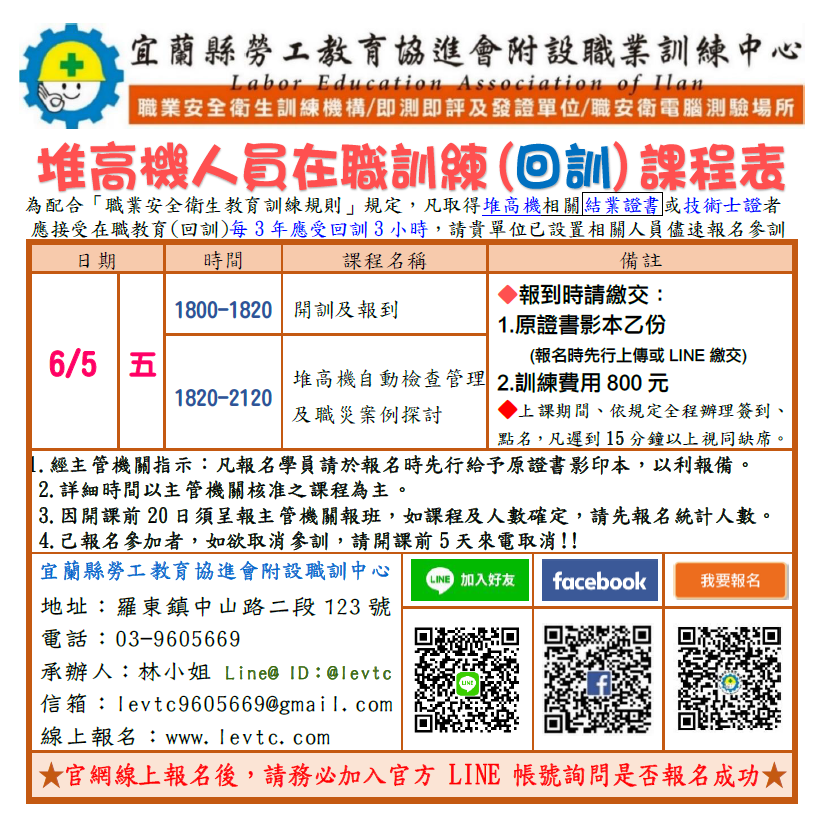 【堆高機回訓】05/15(日間班)報名完成,請來電確認