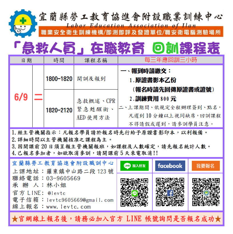 【急救人員回訓】6/9夜間班-報名請確認是否成功