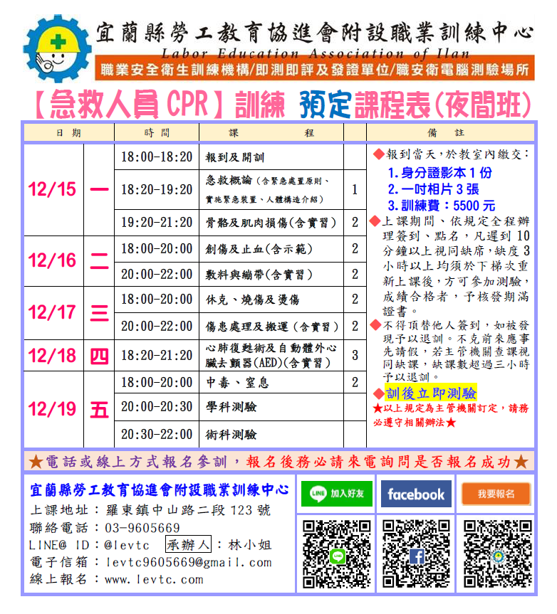 【急救人員-初訓】12/15-19夜間班預定開課 招生中請先報名