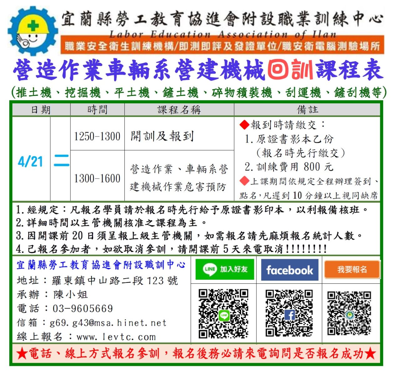 【營造作業、車輛系營建機械作業】怪手、山貓回訓 4/21開課