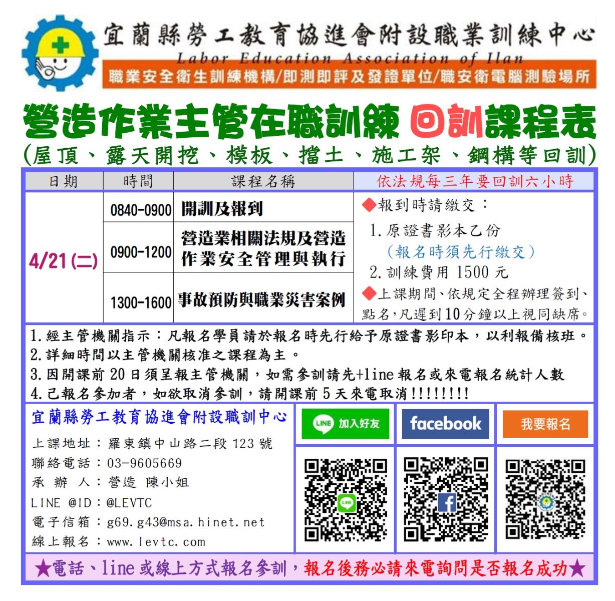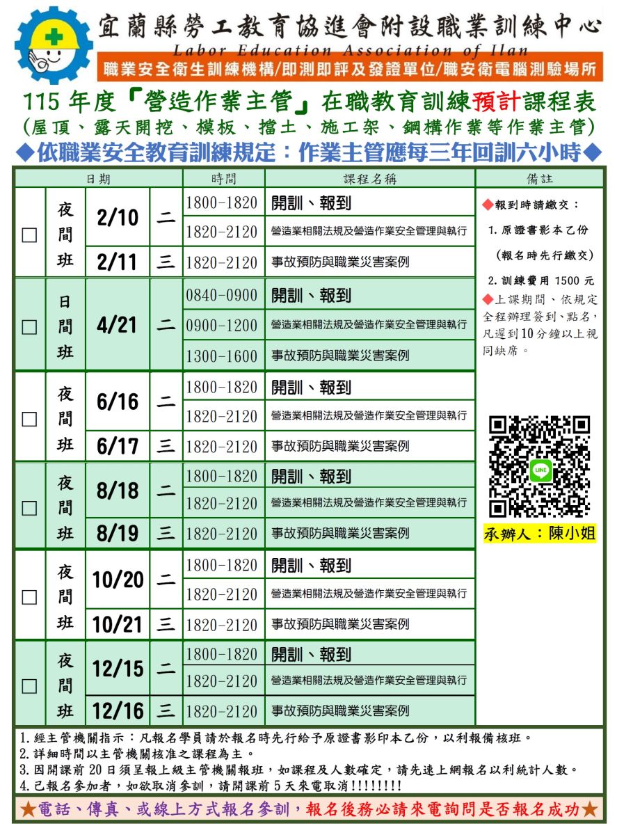 資格限制:須具備營造業作業主管資格者並擔任相關工作者,每三年應至少參加6小時之在職教育訓練。