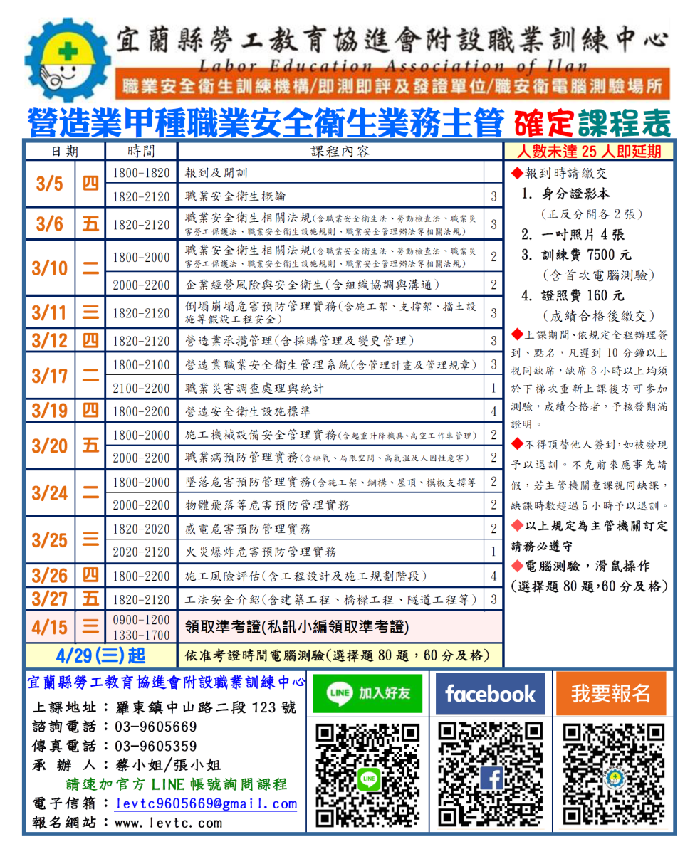 ※電話、傳真、線上報名參訓、報名成功者,將會回覆"報名序號",若無序號者,請勿自行前來上課(因現況報名須將資料上傳至職安署內部資訊系統,若無報名序號者切勿自行前來上課)※