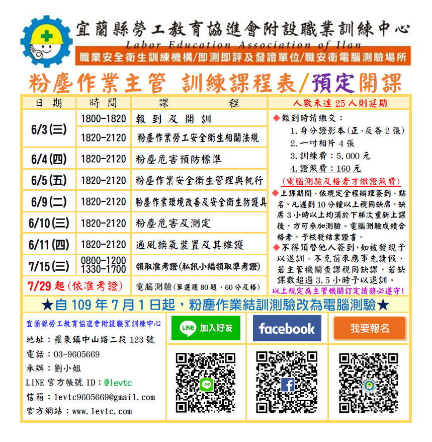 想知道本中心最新開課簡章或是勞安最新資訊嗎?為了讓您的勞安專業知識不落人後,趕快來我們的Facebook粉絲團網頁按讚,任何新資訊您將不會錯過~請至臉書搜尋”宜蘭縣勞工教育協進會”按一個讚即可得知最新消息。