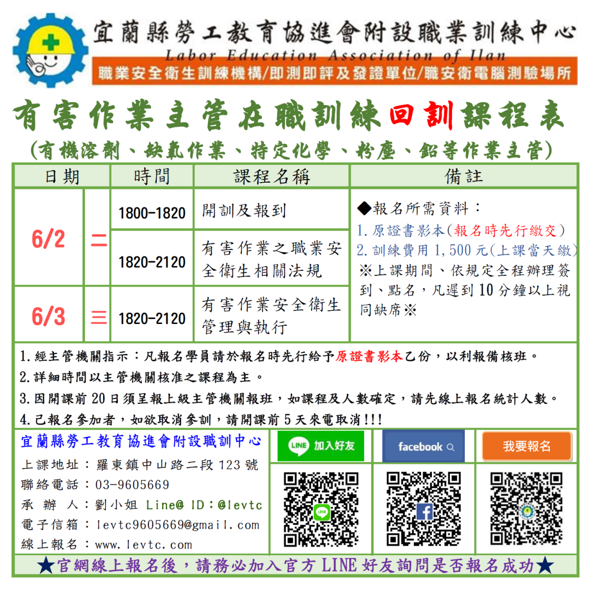 【缺氧/有機溶劑/粉塵/特化/鉛】6/2-3夜間班回訓 招生中