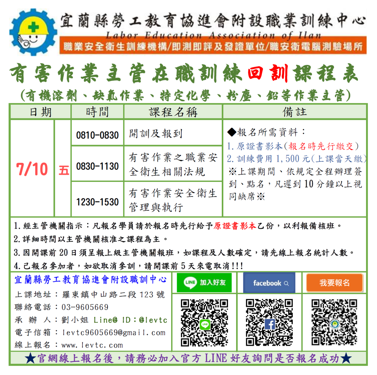 注意事項:需先將「初訓證書」拍傳至本中心官方LINE https://lin.ee/2DRV0Bo,或傳真至本中心(03)9605359。