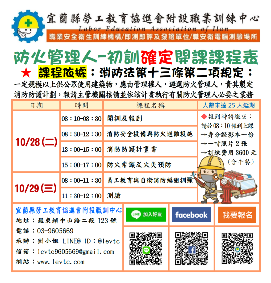 ※消防施行細則第十四條規定:初訓:防火管理員應為管理或監督層次,並經直轄市、縣(市)消防機關或中央消防機關認可之專業機構講習訓練合格領有證書始得充任。