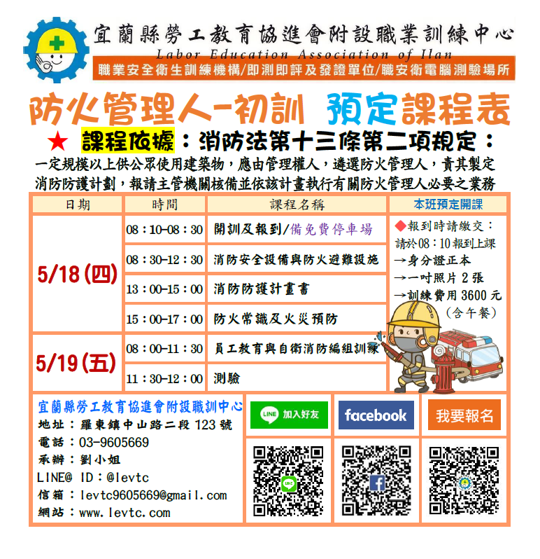 ★課程依據:消防法第十三條規定:一定規模以上供公眾使用建築物,應由管理權人,遴選防火管理人,責其製定消防防護計劃,報請主管機關核備並依該計畫執行有關防火管理人必要之業務。