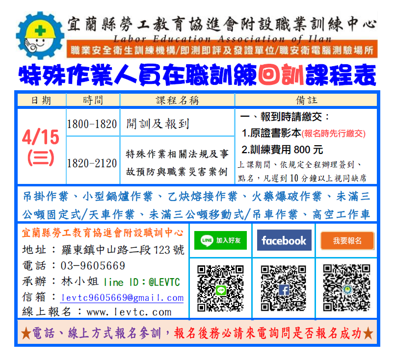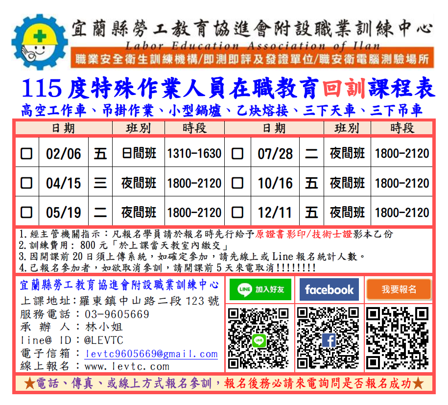 注意事項:★需先將「初訓證書」拍傳至本中心官方LINE https://lin.ee/2DRV0Bo,或傳真至本中心(03)9605359。