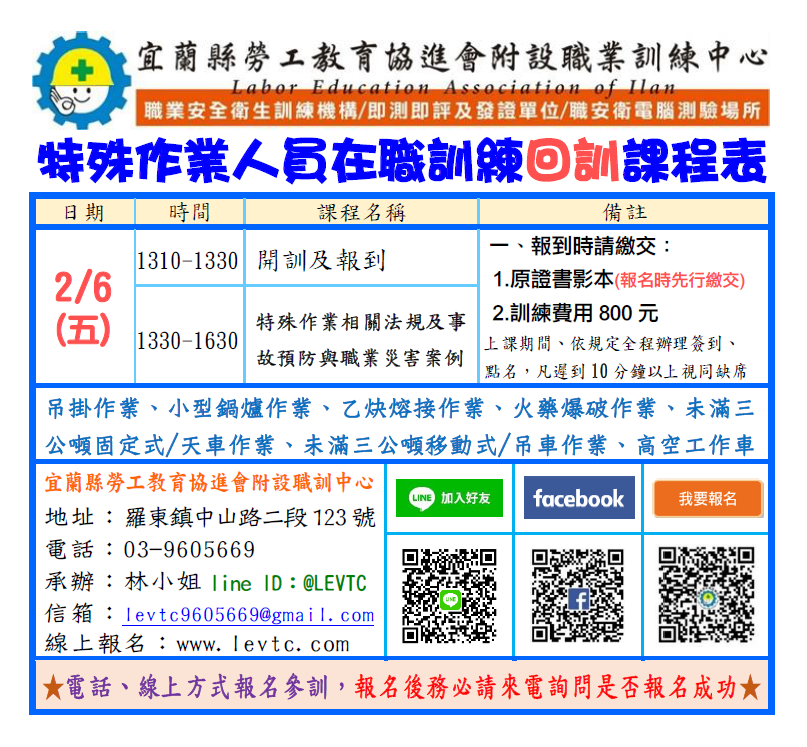 【高空工作車、吊掛手、小型鍋爐、乙炔熔接、三公噸以下固定式、移動式起重機操作人員】02/06回訓(日間班)