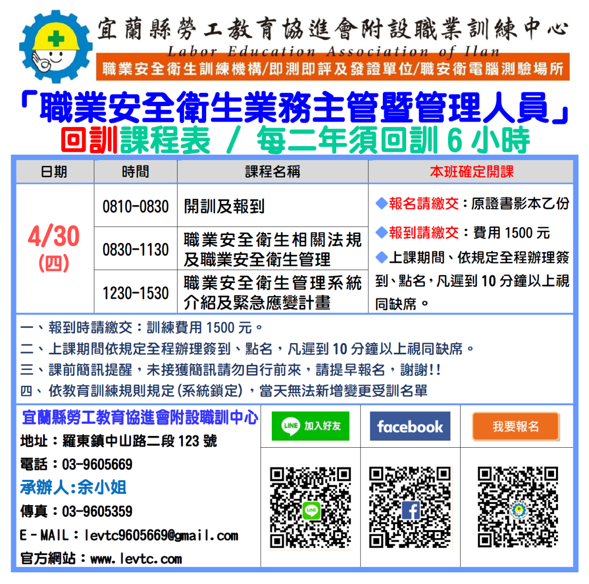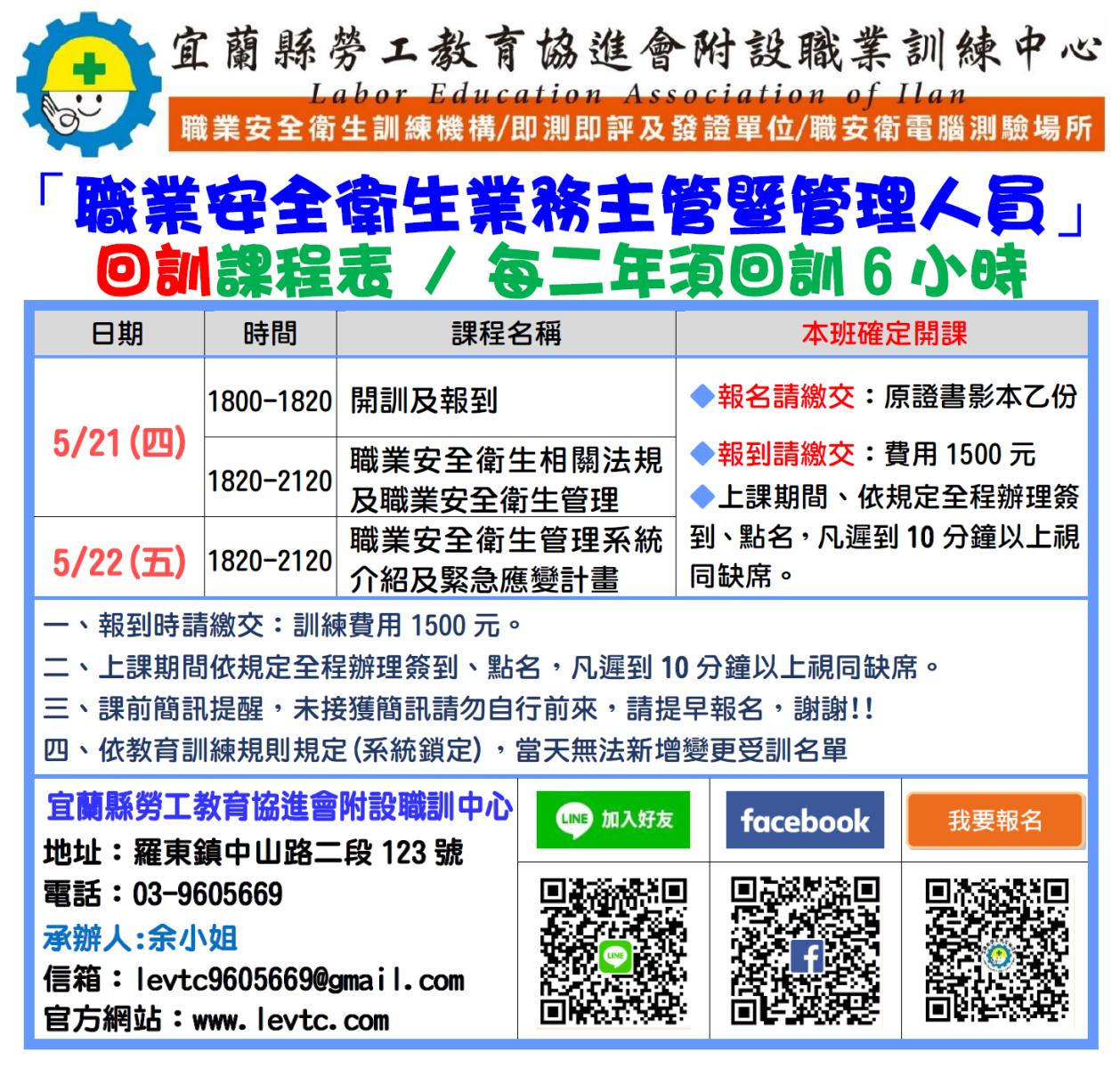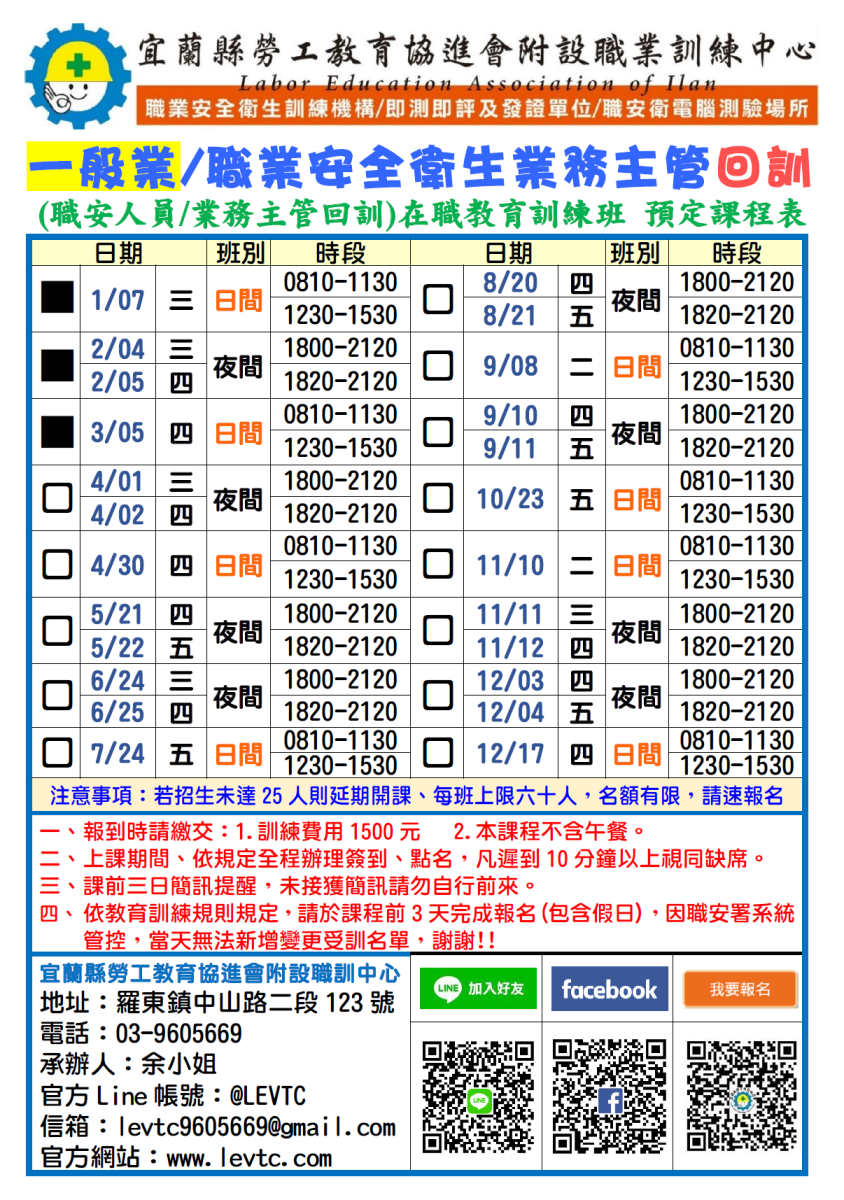 (本班為一般業職安人員回訓,營造業要報名另一班上課!!)