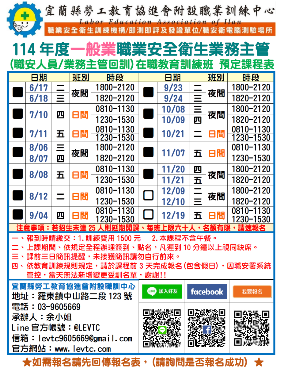 (本班為一般業職安人員回訓,營造業要報名另一班上課!!)