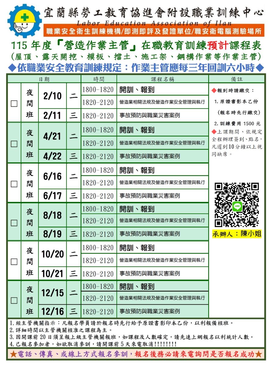資格限制:須具備營造業作業主管資格者並擔任相關工作者,每三年應至少參加6小時之在職教育訓練。