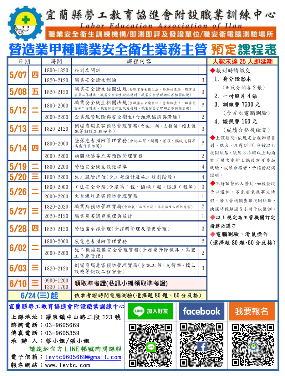 ※電話、傳真、線上報名參訓、報名成功者,將會回覆"報名序號",若無序號者,請勿自行前來上課(因現況報名須將資料上傳至職安署內部資訊系統,若無報名序號者切勿自行前來上課)※